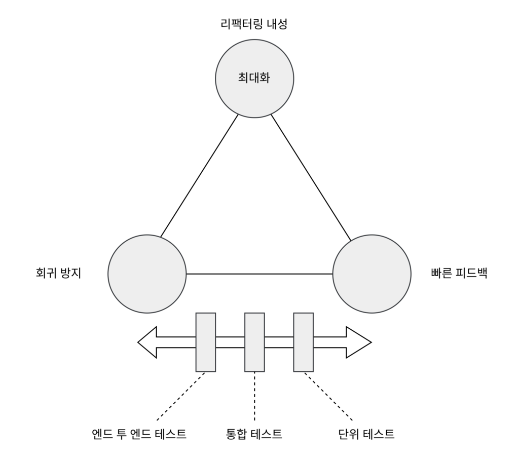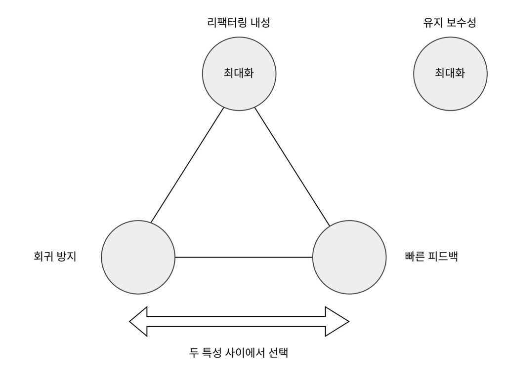 여기서 회귀 방지, 리팩터링 내성, 빠른 피드백은 서로 배타적인 성격이 있기 때문에 일반적으로 3가지 모두 충족하기는 어렵다.