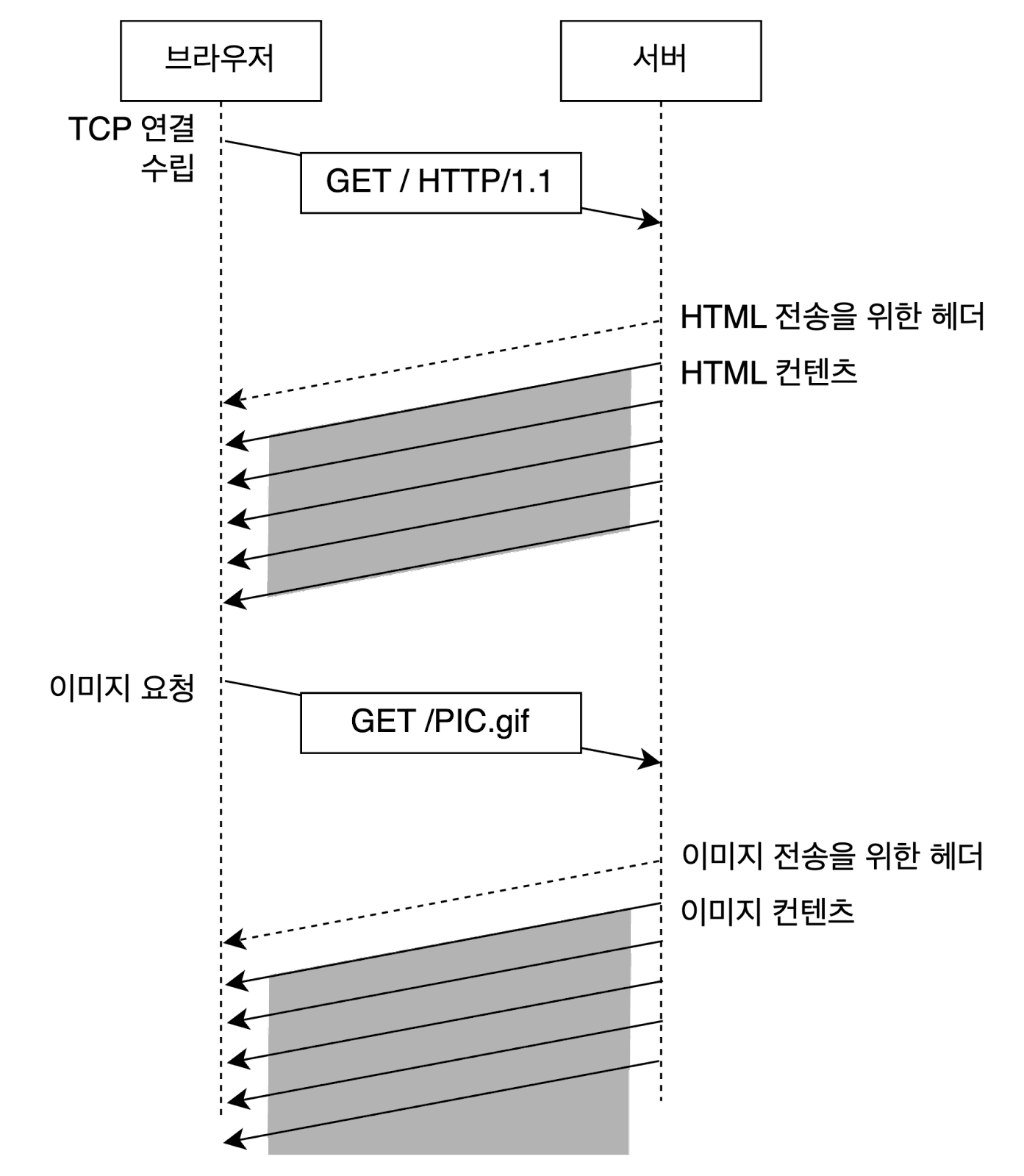 HTTP 통신은 TCP 소켓을 통해 이루어 집니다. HTTP 1.1은 불필요한 설정 비용(setup cost)을 반복하지 않기 위해 개별 소캣을 재사용하도록 되어 있습니다. 다만 여러 요청이 소켓을 공유하는 경우에도 요청이 순서대로 반환되도록 설계되었습니다. (파이프라인으로 알려짐)