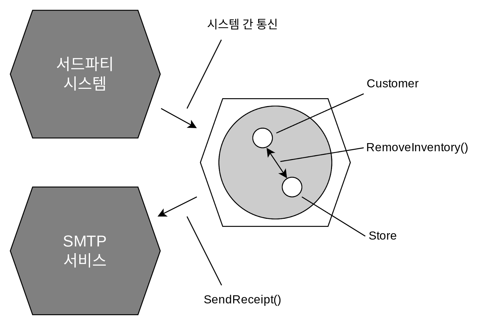 육각형의 각 면은 애플리케이션 내외부 연결을 나타낸다.