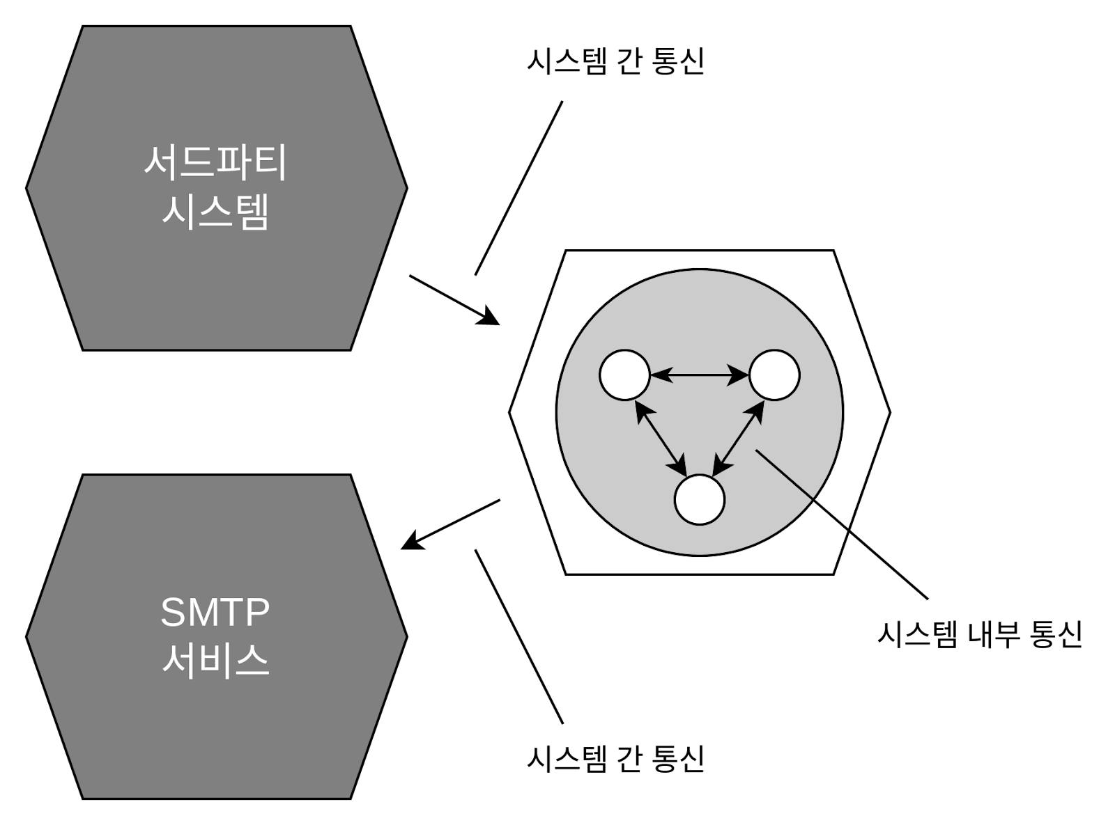 애플리케이션들은 다른 애플리케이션과 소통할 수 있고, 다른 애플리케이션도 육각형으로 나타낸다.