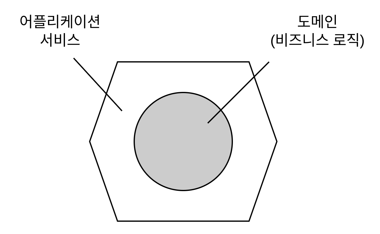 애플리케이션 서비스 계층과 도메인 계층의 조합을 육각형으로 나타내며 이 육각형은 애플리케이션을 의미한다.