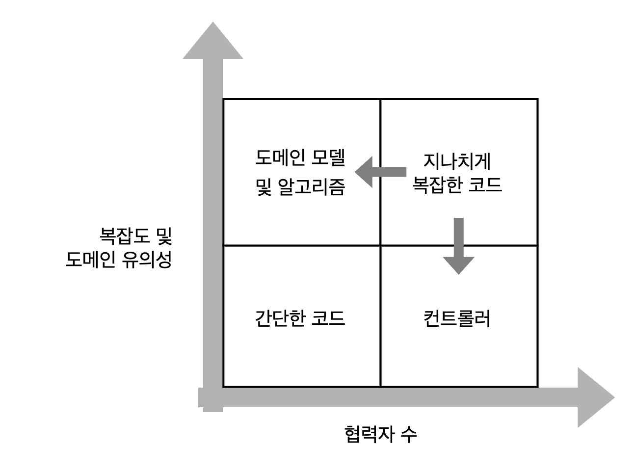 지나치게 복잡한 코드는 알고리즘과 컨트롤러로 나눠서 리팩터링하라. 이상적으로는 우측 상단 사분면에 속하는 코드가 있으면 안된다.