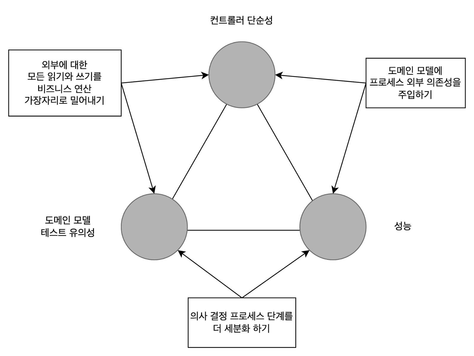 - 외부에 대한 모든 읽기와 쓰기를 비즈니스 연산 가장자리로 밀어내기: 컨트롤러를 계속 단순하게 하고 프로세스 외부 의존성과 도메인 모델을 분리하지만, 성능이 저하된다.