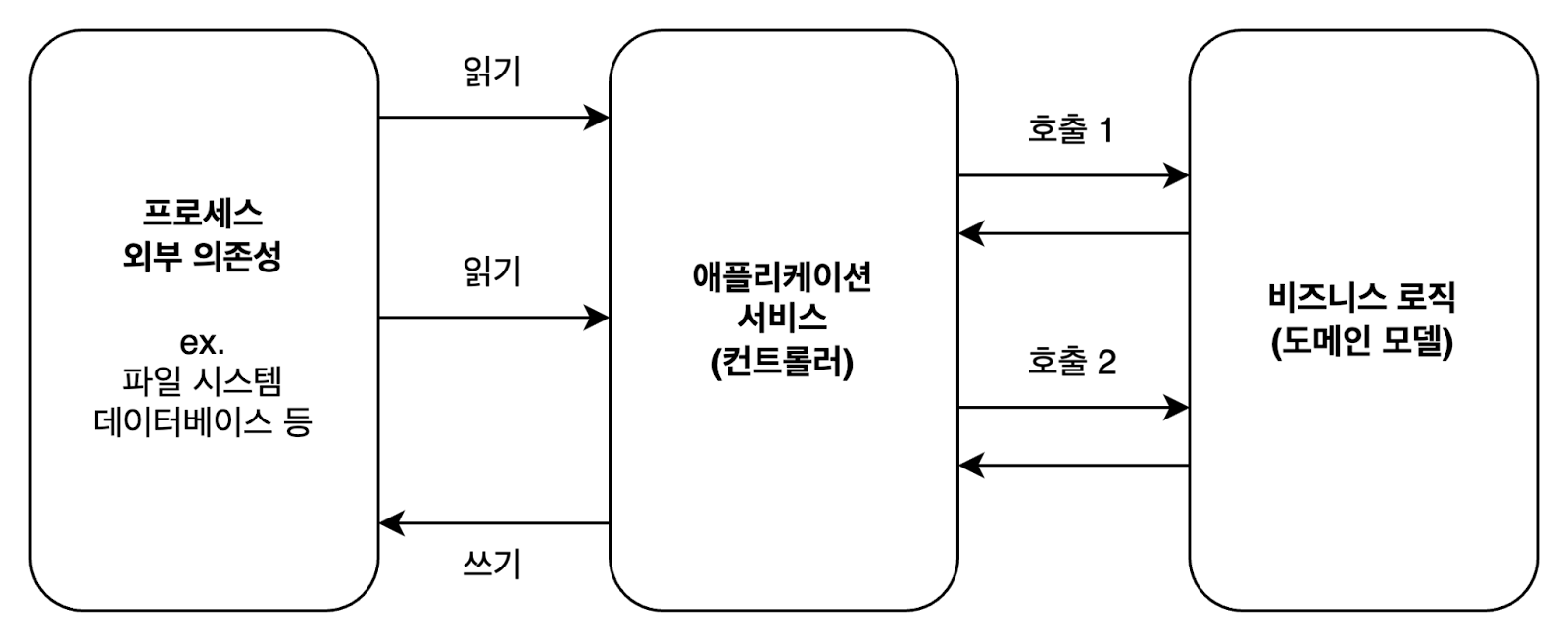 - 어쨌든 외부에 대한 모든 읽기와 쓰기를 가장자리로 밀어낸다. 이 방법은 “읽고-결정하고-실행하기” 구조를 유지하지만 성능이 저하된다. 필요 없는 경우에도 컨트롤러가 프로세스 외부 의존성을 호출한다.